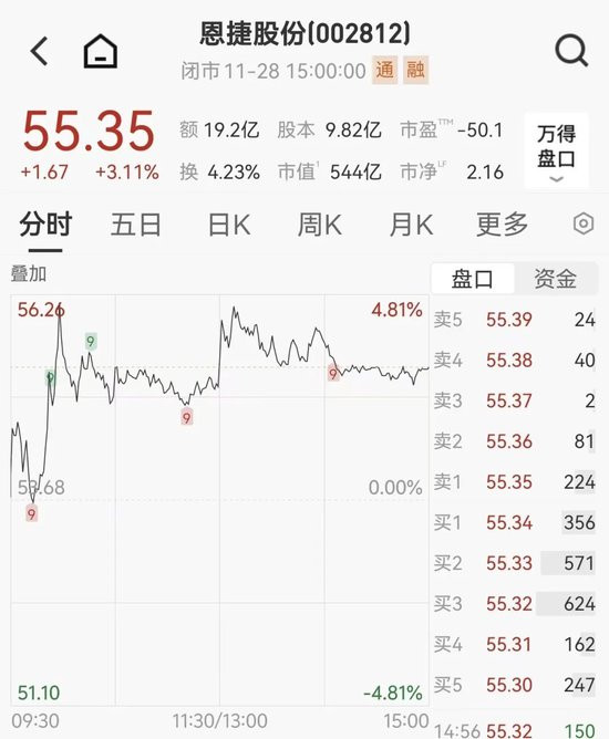 截至11月28日收盘,恩捷股份股价报55.35元/股,市值544亿元。