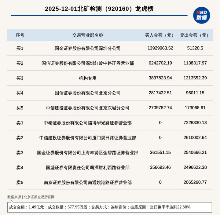 每经讯,2025年12月1日,北交所上市公司北矿检测(920160,收盘价:26.1元)登上龙虎榜,交易方式是连续竞价,披露原因是当日换手率达到22.68%,成交数量577.95万股,成交金额1.49亿元。买一席位为国金证券股份有限公司深圳分公司,买入1393万元;卖一席位为中泰证券股份有限公司淄博华光路证券营业部,卖出722.63万元。